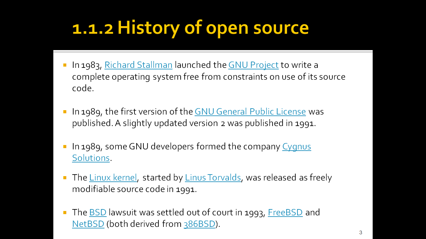 Source Software (OSS) which includes the history of OSS, Open standards, OSS